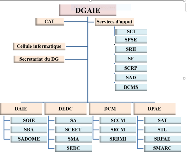 La DGAIE est structurée comme suit :la Direction générale;les services d’appui;les directions techniques. Organigramme LA DIRECTION GENERALELa Direction générale comprend :le Directeur général;le Secrétariat du Directeur général;les Chargés d’appui technique (CAT) ;la Cellule informatique. LES SERVICES D’APPUILe Service du contrôle interne (SCI) ;Le Service de planification, de suivi et d'évaluation (SPSE);Le Service des ressources humaines (SRH) ;Le Service financier (SF) ;Le Service de la communication et des relations publiques (SCRP) ;Le Service des archives et de la documentation (SAD) Le Bureau comptable des matières secondaires (BCMS). LES DIRECTIONS TECHNIQUES- La Direction des affaires immobilières de l’Etat (DAIE)La DAIE est composée des services ci-après :le Service du patrimoine immobilier de l’Etat (SPIE);le Service des opérations immobilières de l'Etat (SOIE) ;le Service de l’aliénation des biens du domaine mobilier de l’Etat (SADOME).- La Direction de la comptabilité des matières (DCM)La DCM comprend les services suivants :le Service de la centralisation de la comptabilité des matières (SCCM);le Service du réseau des comptables matières (SRCM);le Service des réceptions des biens mobiliers et immobiliers (SRBMI).- La Direction de l’équipement de l’Etat et des dépenses communes (DEDC) le service des acquisitions (SA) ;le service du suivi des consommations d’eau, d’électricité et de téléphone (SCEET) ;le service des magasins et ateliers (SMA) ;le service des engagements des dépenses communes (SEDC).- La Direction du parc automobile de l’Etat (DPAE)La DPAE comprend les services suivants :le service d'assistance technique (SAT);le service du transport et de la logistique (STL);le service de la règlementation du parc automobile de l'Etat (SRPAE);le service du matériel roulant et des consommables (SMARC).